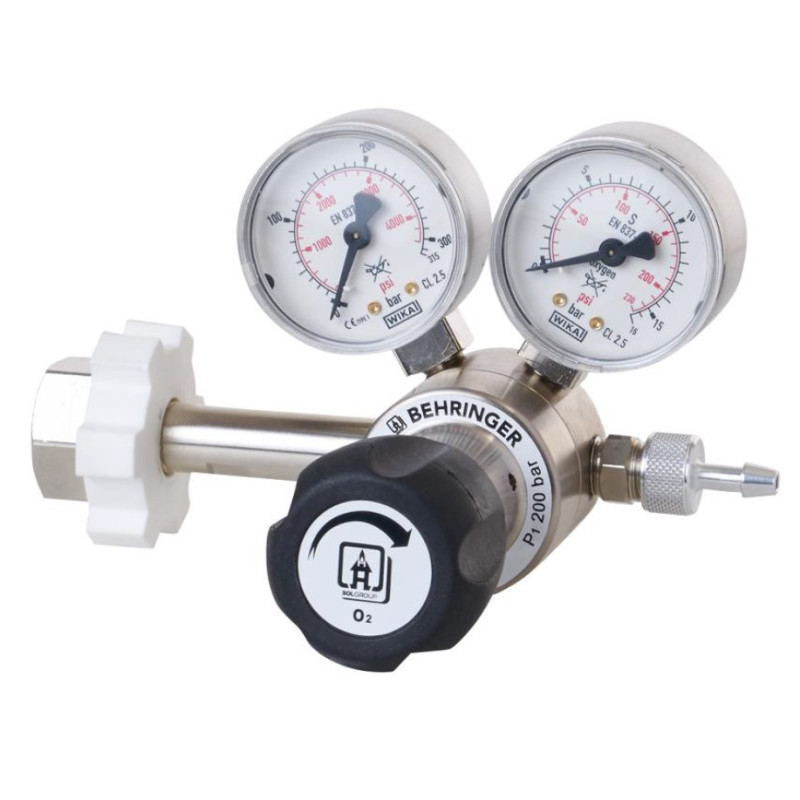 Riduttore di pressione da bombola, adatto all'utilizzo di gas medicinali, dotato di due manometri per indicare la pressione della bombola e la pressione di esercizio, utilizzato in uscita dalle bombole per ridurre la pressione sino a quella di linea o di utilizzo.